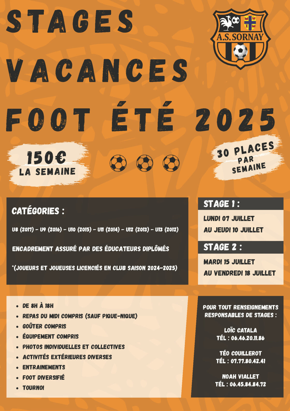 L’AS Sornay organise 2 stages d’été pour les U8 (2016) à U13 (2011) :